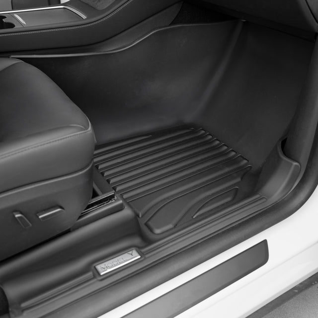 This item includes: custom-fit driver and passenger floor mats, rear floor mats, cargo liners, and a trunk mat for the Tesla Model Y Juniper.